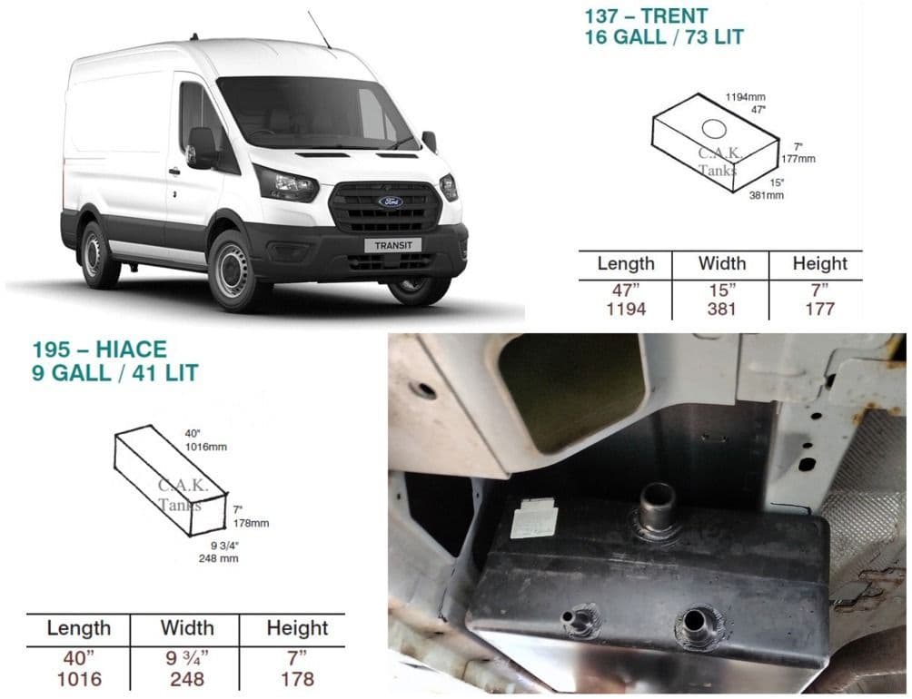 Home / Water Tanks / Vehicle Specific Kits - Campervan Underslung Water Tanks / Ford Transit 2014 Product Description Ford Transit 2013 Onwards L3 & L4 Fresh and Waste Water Tank ALL MODELS (Offside Parallel With Fuel Tank) This kit comes with a black locking filler. (White and Grey also available). The fresh tank is designed to fit offside behind the drivers step and the waste tank fits nearside behind the sliding door step. Both tanks have all the relevant inlets and outlets pre-welded on to the tank itself. KIT CONTAINS:- - 1x CAK-137 Water Tank with Fresh Fittings - 1x CAK-195 Water Tank with Waste Fittings - 2x Sets Holding Brackets - 2x Sets of Hook Bolts for Brackets - 1x 40mm Filler Neck Locking Cap + 2 Keys BLACK FILLER - 1x 1M Length of Blue 40mm Filler Pipe - 2x 40mm Hose Clips - 1x Remote Drain Tap Kit (BLUE) - 1x Remote Drain Tap Kit (GREY) OPTIONAL CONTENTS:- - 1x Combined Fresh & Waste Water Level Gauge with Read out Panel (MT214/G) - 2x Level Sensors to Suit CBE Control Panel Kit (SPE/160 for Fresh & SPE/160 for Waste) Specifications Product Code CAK-137F195WKITB Weight 55kg Customer reviews No reviews left yet Write A Review Sort byMost RecentTop Rated Description Ford Transit 2013 Onwards L3 & L4 Fresh and Waste Water Tank ALL MODELS (Offside Parallel With Fuel Tank) This kit comes with a black locking filler. (White and Grey also available). The fresh tank is designed to fit offside behind the drivers step and the waste tank fits nearside behind the sliding door step. Both tanks have all the relevant inlets and outlets pre-welded on to the tank itself. KIT CONTAINS:- - 1x CAK-137 Water Tank with Fresh Fittings - 1x CAK-195 Water Tank with Waste Fittings - 2x Sets Holding Brackets - 2x Sets of Hook Bolts for Brackets - 1x 40mm Filler Neck Locking Cap + 2 Keys BLACK FILLER - 1x 1M Length of Blue 40mm Filler Pipe - 2x 40mm Hose Clips - 1x Remote Drain Tap Kit (BLUE) - 1x Remote Drain Tap Kit (GREY) OPTIONAL CONTENTS:- - 1x Combined Fresh & Waste Water Level Gauge with Read out Panel (MT214/G) - 2x Level Sensors to Suit CBE Control Panel Kit (SPE/160 for Fresh & SPE/160 for Waste) Reviews No reviews left yet Write A Review Sort byMost RecentTop Rated Attributes Product Code CAK-137F195WKITB Weight 55kg Delivery & Returns Customer Reviews 73L Fresh & 41L Waste Water Tank Kit for Ford Transit MK8 RWD L3 & L4 2014 Onwards BLACK FILLER Product Code CAK-137F195WKITB CAK-137F195WKITB £330.00 Login to add this product to your wishlist.