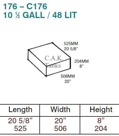 Home / Water Tanks Product Description Suitable for drinking water, waste or toilet discharge. A strong and reliable water storage tank for caravans, motorhomes, campers and specialist vehicles. Moulded in black polyethylene to the highest specifications for drinking water use. One piece, seam free moulding. No welded joints that can crack prematurely. Our tanks will not leak, split, rust or corrode. Designed for the safe, reliable storage and transport of drinking water and grey or black waste-water. Our tanks are black to prevent the growth of algae. Your fresh water will stay fresher for longer with no aftertaste. Fit under the chassis or anywhere inside your vehicle. We offer a large variety of shapes and sizes. Our tanks can be customised with water gauges, water level sensors, nut in fittings, drain taps, valves, hatches, submersible pump adaptors etc. We carry a wide range of connectors and fittings for you to install connections where you want for whatever your intended use of the tank is. Please see our Water Tanks Accessories section for additional nut in fittings. Specifications Brand C.A.K. Tanks Condition New Product Code CAK-176 Weight 10kg Customer reviews No reviews left yet Write A Review Sort byMost RecentTop Rated Description Suitable for drinking water, waste or toilet discharge. A strong and reliable water storage tank for caravans, motorhomes, campers and specialist vehicles. Moulded in black polyethylene to the highest specifications for drinking water use. One piece, seam free moulding. No welded joints that can crack prematurely. Our tanks will not leak, split, rust or corrode. Designed for the safe, reliable storage and transport of drinking water and grey or black waste-water. Our tanks are black to prevent the growth of algae. Your fresh water will stay fresher for longer with no aftertaste. Fit under the chassis or anywhere inside your vehicle. We offer a large variety of shapes and sizes. Our tanks can be customised with water gauges, water level sensors, nut in fittings, drain taps, valves, hatches, submersible pump adaptors etc. We carry a wide range of connectors and fittings for you to install connections where you want for whatever your intended use of the tank is. Please see our Water Tanks Accessories section for additional nut in fittings. Reviews No reviews left yet Write A Review Sort byMost RecentTop Rated Attributes Brand C.A.K. Tanks Condition New Product Code CAK-176 Weight 10kg Delivery & Returns Customer Reviews C176 TANK Product Code CAK-176 CAK-176 £118.58 Login to add this product to your wishlist.
