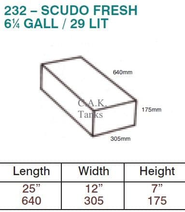 Home / Water Tanks Product Description Suitable for drinking water, waste or toilet discharge. A strong and reliable water storage tank for caravans, motorhomes, campers and specialist vehicles. Moulded in black polyethylene to the highest specifications for drinking water use. One piece, seam free moulding. No welded joints that can crack prematurely. Our tanks will not leak, split, rust or corrode. Designed for the safe, reliable storage and transport of drinking water and grey or black waste-water. Our tanks are black to prevent the growth of algae. Your fresh water will stay fresher for longer with no aftertaste. Fit under the chassis or anywhere inside your vehicle. We offer a large variety of shapes and sizes. Our tanks can be customised with water gauges, water level sensors, nut in fittings, drain taps, valves, hatches, submersible pump adaptors etc. We carry a wide range of connectors and fittings for you to install connections where you want for whatever your intended use of the tank is. Please see our Water Tanks Accessories section for additional nut in fittings. Specifications Brand C.A.K. Tanks Condition New Product Code CAK-232 Weight 3kg Customer reviews No reviews left yet Write A Review Sort byMost RecentTop Rated Description Suitable for drinking water, waste or toilet discharge. A strong and reliable water storage tank for caravans, motorhomes, campers and specialist vehicles. Moulded in black polyethylene to the highest specifications for drinking water use. One piece, seam free moulding. No welded joints that can crack prematurely. Our tanks will not leak, split, rust or corrode. Designed for the safe, reliable storage and transport of drinking water and grey or black waste-water. Our tanks are black to prevent the growth of algae. Your fresh water will stay fresher for longer with no aftertaste. Fit under the chassis or anywhere inside your vehicle. We offer a large variety of shapes and sizes. Our tanks can be customised with water gauges, water level sensors, nut in fittings, drain taps, valves, hatches, submersible pump adaptors etc. We carry a wide range of connectors and fittings for you to install connections where you want for whatever your intended use of the tank is. Please see our Water Tanks Accessories section for additional nut in fittings. Reviews No reviews left yet Write A Review Sort byMost RecentTop Rated Attributes Brand C.A.K. Tanks Condition New Product Code CAK-232 Weight 3kg Delivery & Returns Customer Reviews New Fiat Scudo Fresh Product Code CAK-232 CAK-232 £91.82 Login to add this product to your wishlist.